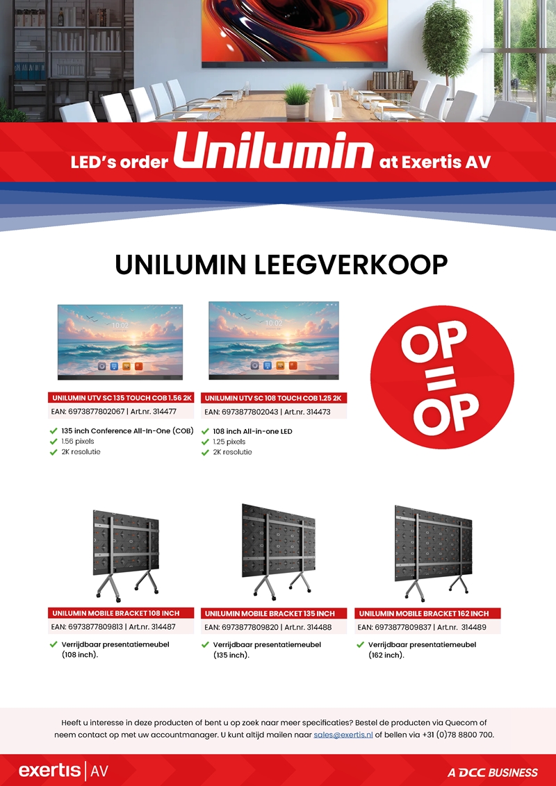 Interesse in de producten van Unilumin en de gave openingsactie? Neem contact op met uw accountmanager, mail ons via [email protected] of bel naar +31(0)78 880 0700.
