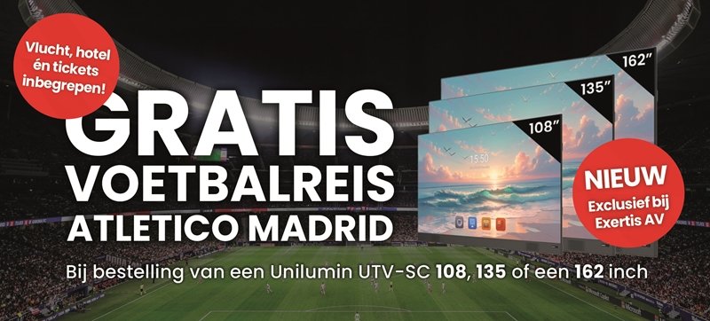 Bij aanschaf van een Unilumin all-in-one UTV-SC LED-scherm (108, 135 of 162 inch) ontvangt u tijdelijk twee tickets voor een duel van Atletico Madrid cadeau, incl. vliegtickets en twee hotelovernachtingen in een door ons te bepalen hotel.